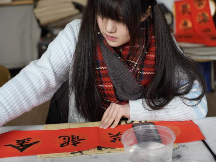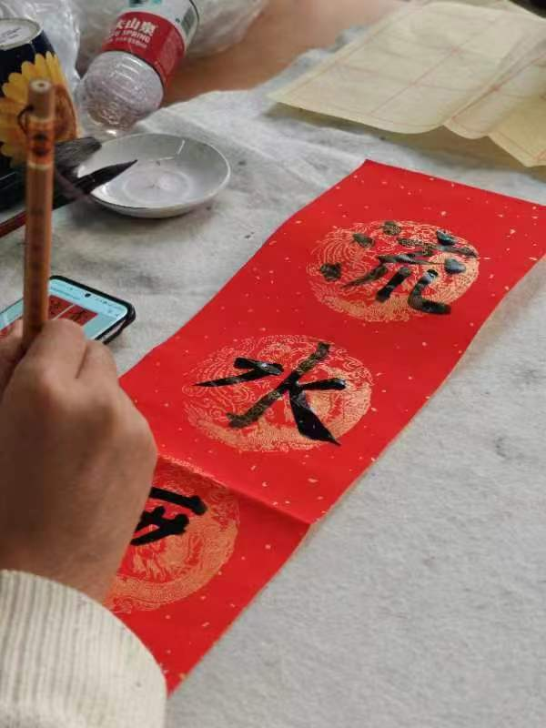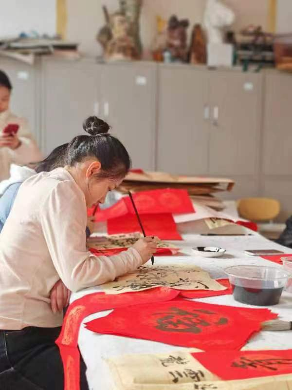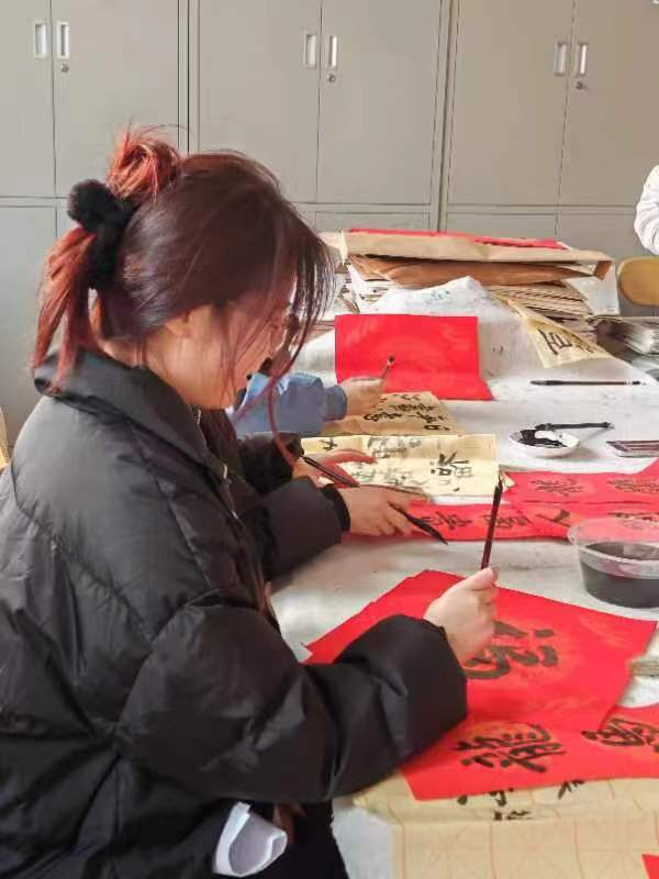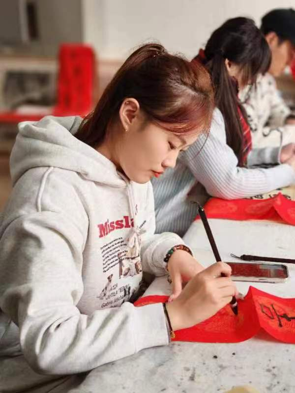 活动现场墨香四溢,气氛温馨热烈,师生们手持毛笔,在红纸上挥洒自如,一幅幅对联如云鹤游天,群鸿戏海般蓬勃而出。如果说对联体现的是同学们对新年的期盼,那么这一个个“福”字正是同学们对“福”到的期许。福倒即福到,蕴含的正是同学们对美好生活的期许。公司团委书记、学工办主任张恬老师说:“练字的过程是一笔一墨一砚一人一心的完美结合。一画之间,变起伏于锋杪,一点之内,殊衄挫于毫芒。读书读世界,写字写人生,一幅幅极具艺术感染力凝聚着咱们师生对新年美好生活的憧憬和向往。”