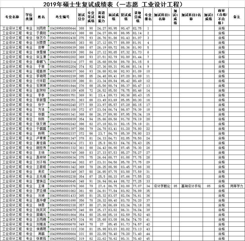 太阳成集团tyc2019年硕士研究生复试成绩表-调剂 工业设计工程