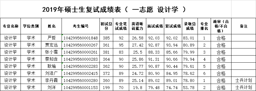 太阳成集团tyc2019年硕士研究生复试成绩表- 一志愿 设计学