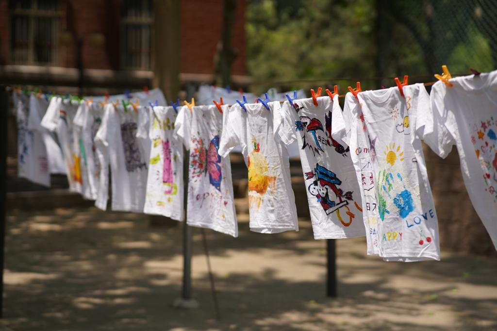 “以画笔为媒,展现内心世界;以色彩为介,传递温暖爱心。”这是“以心执笔,画解心情”服装绘制活动的现场,员工们自由组成两人一队,领取需要的工具和颜料,在服装上自由绘制喜欢的图案,从构思、勾线到着色,参与者发挥自身专业设计能力与创新思维,使简单的T恤变得各具特色,将一件件衣服在这特殊的一天赋予不同的内涵。作品《小王子》展现了员工对爱的理解“爱不需要你与众不同,但因为我爱你,所以你变得与众不同”;《蝴蝶繁花》则体现了创作者想要传达“繁花似锦觅安宁,淡云流水度此生”的人生态度。绘制结束后,公司将所有衣服挂于教学楼门前进行展览和义卖。