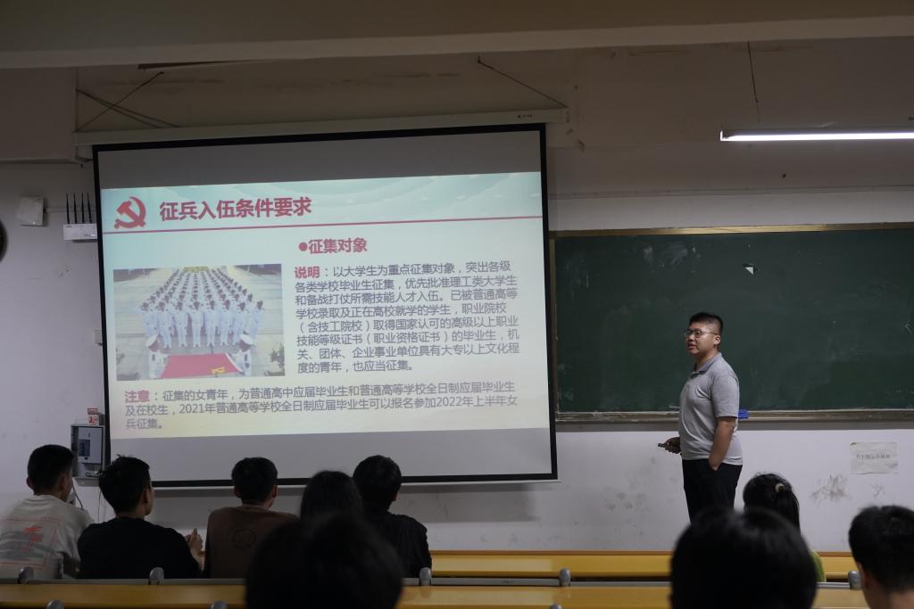 会议伊始,李钦带领员工观看征兵宣传视频,视频中和精彩的军队风采和军旅生涯激荡着广大同学携笔从戎矢志报国的赤子之心。随后,李钦围绕国防背景、参军条件、时间安排、退役政策等方面介绍了当前征兵工作的相关要求和流程,李钦鼓励同学们要敢于有梦、敢于追梦、敢于圆梦,让青春在军营的历练中、在为祖国的奉献中闪光。