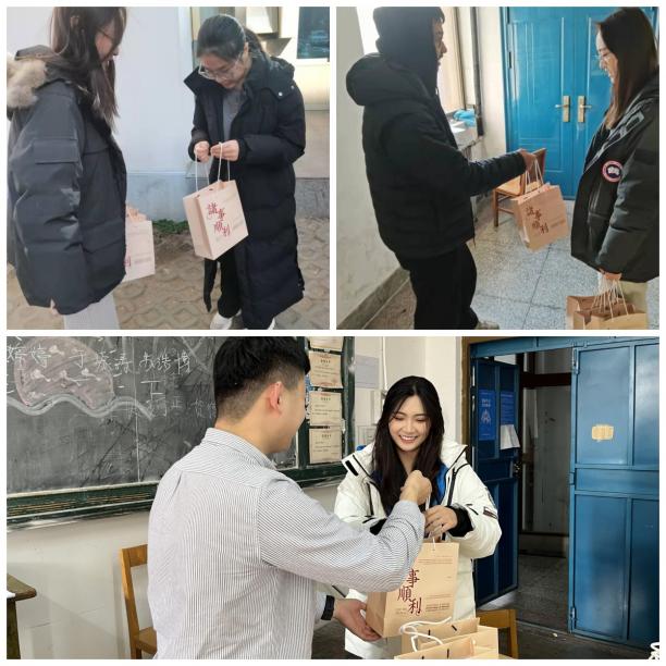 环设183团支部紧锣密鼓的为考研同学们精心制作了考研盲盒。大家合作分工,自动组成“流水线小分队”,有的折纸盒缠丝带、有的撰写卡片、有的进行分装和礼盒打包,现场氛围热火朝天,“不畏风雨,不惧风险”,“当下如水,未来如诗”,“考研上岸,一切顺遂”……一张张明信片写满期待,一声声问候温暖人心,一句句鼓舞充满希望。由张恬带队前往寝室、班级、图书馆等场所看望考研同学,为同学们送上考研盲盒,询问了同学们的备考情况,为同学们送去祝福,并提醒大家最后几天时间要调整作息、放平心态,坚持不懈,尽自己最大的努力去备战考研!