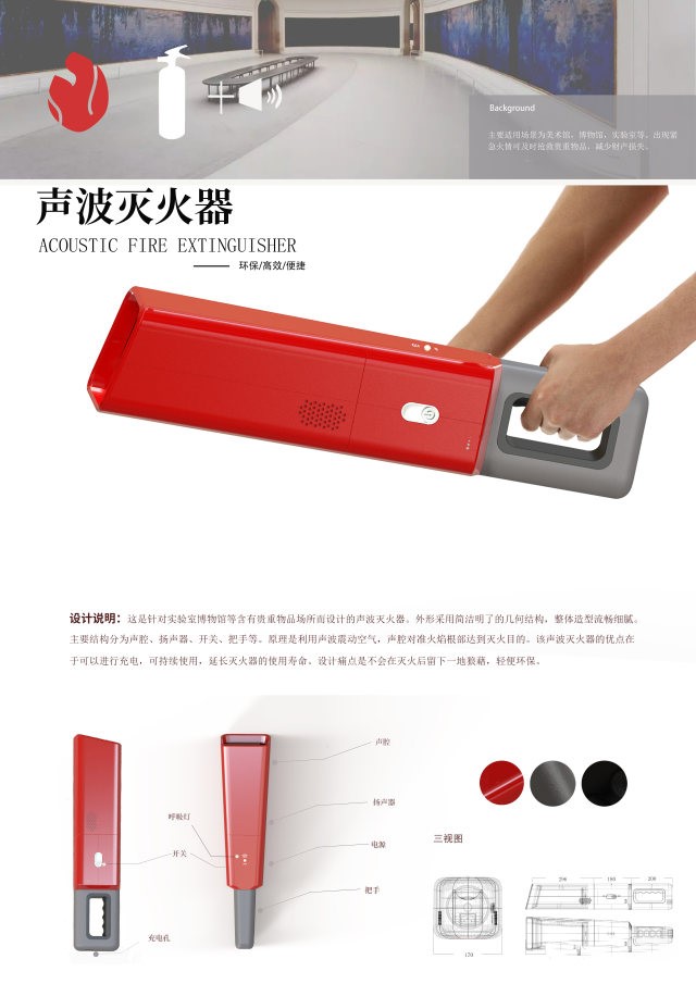 其中,由产品设计教研室李东老师指导的产品设计181班员玮同学的作品《SG-MAKE一体智能滑雪护目镜》获山东赛区一等奖。作品充分调研的基础上确定了其简约、一体化的造型,在功能上增加了AR现实增强技术、声音骨传导技术,可提供滑雪时对雪场和个人状况信息的显示和辅助。雪镜同时还带有照相、音乐、接打电话等功能,若附近带有同雪镜系统的滑雪者,则可以显示对方用户名与信息,提供给滑雪者更自由的社交。由李东老师指导、张爽同学创作的《声波灭火器》荣获山东赛区一等奖。该作品主要针对实验室、博物馆等含有贵重物品的场所而设计的一款灭火器。产品主体结构分为声腔,电源和把手三部分。使用时由低频声波通过扬声器发出,声腔对准火焰根部从而达成灭火目的。设计亮点在于低碳环保易操作,灭火“声过无痕”,极大程度上挽救财产损失。