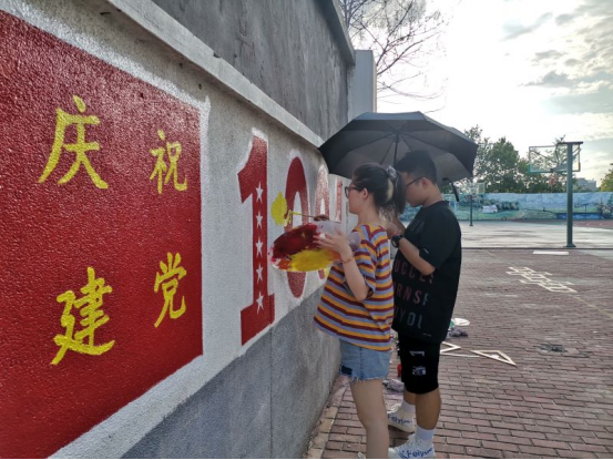 此次志愿服务活动主要由党史讲堂、红色墙绘、爱心助教及校徽、校园文化设计四部分组成。党史讲堂共开展了三天,每天由一名志愿者主讲,将1919年至1949年期间党史中的数十件大事一一进行梳理讲述,通过图片、视频、互动、参观校史馆等形式,给孩子们呈现了一场场生动的党史课。绘制以庆祝建党100周年为主题的墙绘是此次志愿服务活动的重要内容之一,志愿者们前期经过数次的讨论、修改直至最终定稿,起形、上色、描边等环节大家都一丝不苟,经过两天的绘制,主题鲜明、大方美观的墙绘受到了公司老师、同学们的诸多好评。