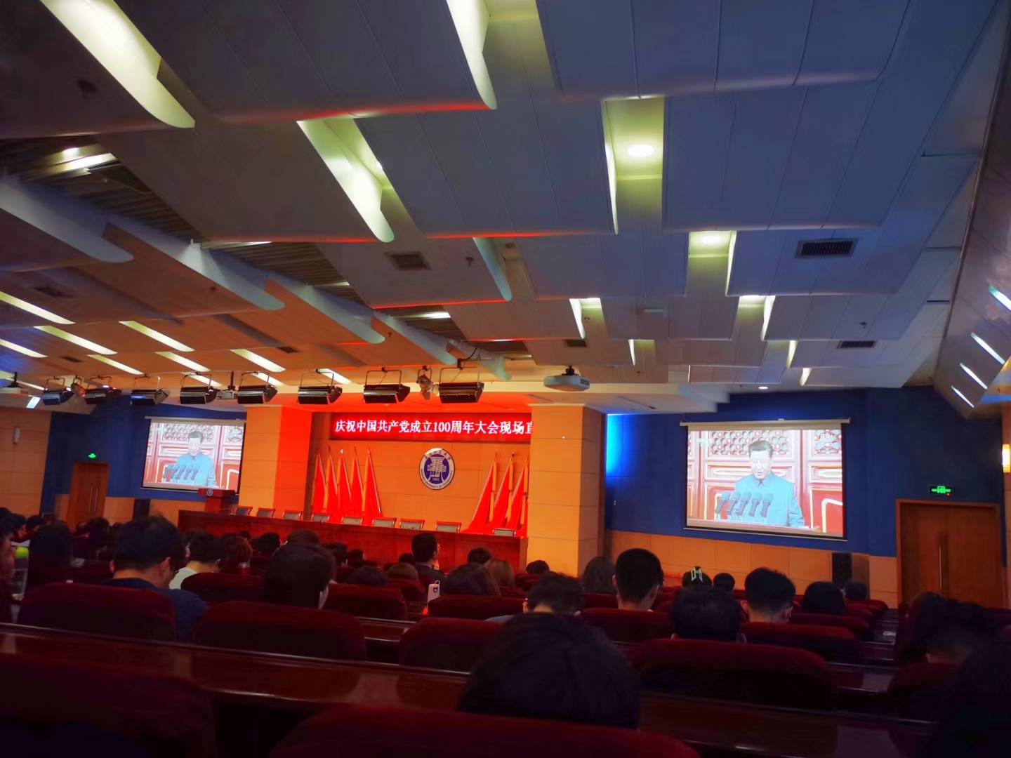 7月1日上午,庆祝中国共产党成立100周年大会在北京天安门广场隆重举行,中共中央总书记、国家主席、中央军委主席习近平发表重要讲话。太阳成集团tyc组织全全体员工共计800余人分别在一教300阶、400阶、500阶、市北校区报告厅收看大会直播。