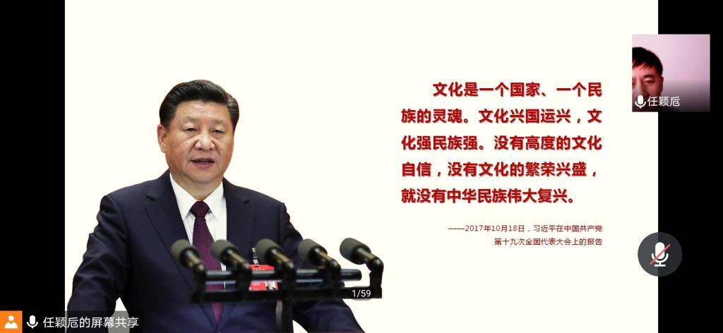 任颖卮教授阐明了文化建设在推进中国特色社会主义事业发展中的重要地位和作用,强调文化建设是中国特色社会主义五位一体总体布局的重要内容。随后,他从习近平总书记对文化的论述出发,结合国内外文化发展形势,围绕文化自信、社会主义核心价值观、中国特色哲学社会科学三点层层陈述,突出讲述坚持中国特色社会主义文化自信对于提高国家文化软实力的重要性。最后,任颖卮表示推动社会主义文化繁荣昌盛意义重大。青年学子应自觉践行社会主义核心价值观,坚定文化自信,增强文化自觉,在坚持走中国特色社会主义道路过程中,不断激发文化创新创造活力,加快构建中国特色哲学社会科学,努力为建设社会主义文化强国贡献力量。