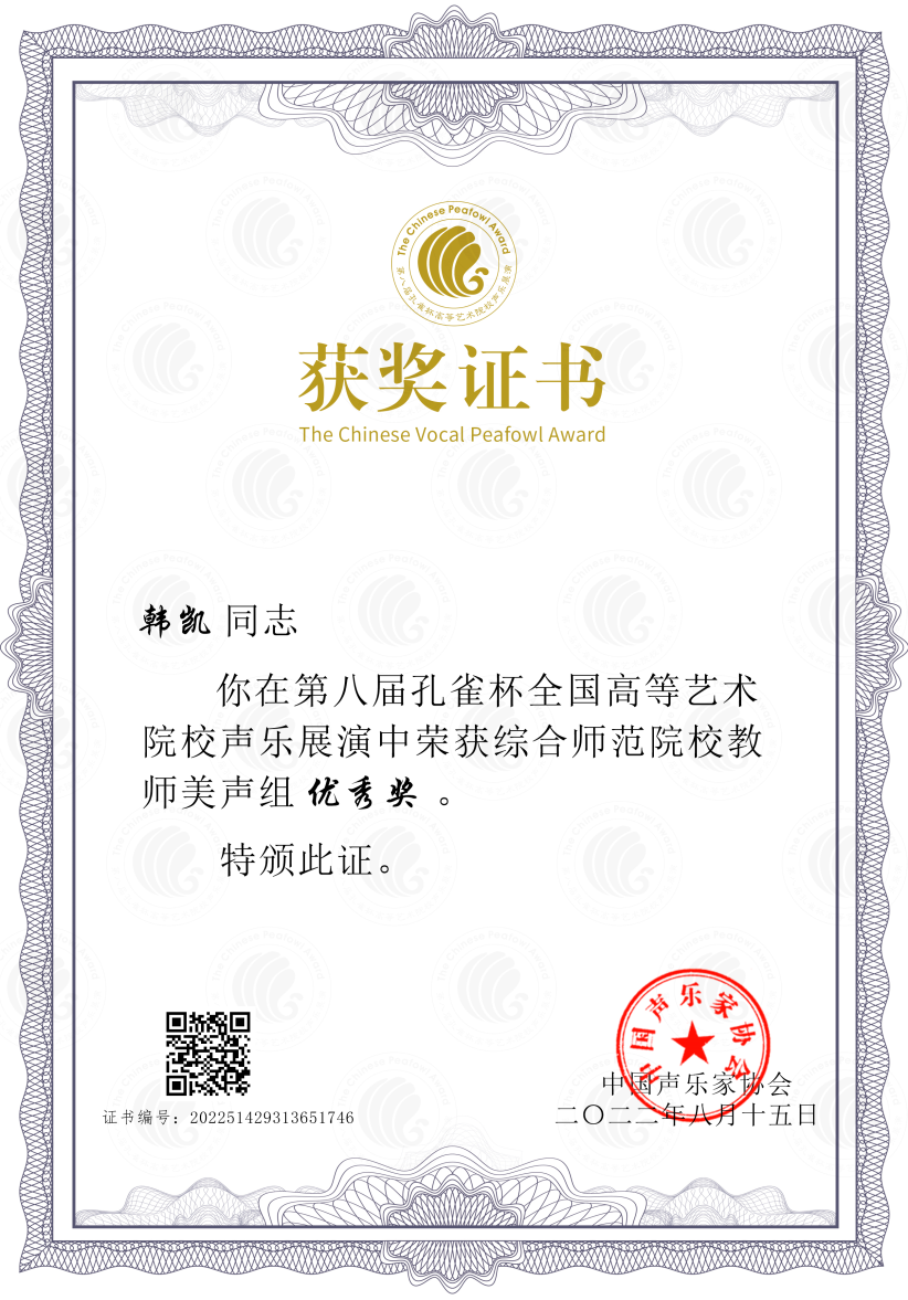 2022年8月8日至15日,第八届孔雀杯全国高等艺术院校声乐展演在宁波大学举行。来自全国260多所院校的1620名选手参加了本次活动。经过初赛、复赛、决赛的三轮比赛选拔,现场激烈角逐,公司太阳成集团tyc韩凯老师表现优异,以德语咏叹调《你是我心中的一切》获得综合师范教师美声组优秀奖。