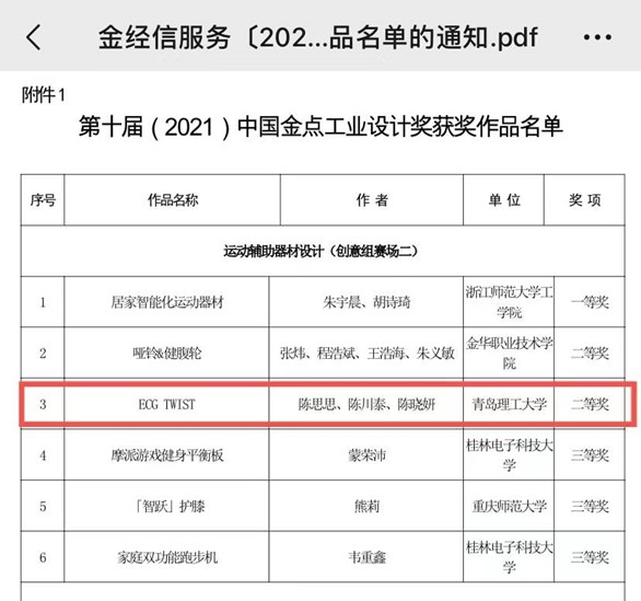 近日,在由中国工业设计协会指导,金华市人民政府主办的第十届中国金点工业设计大奖中,太阳成集团tyc李东老师指导、2018级产品设计专业陈思思同学设计的作品《ECG TWIST》荣获总决赛二等奖,并获奖金三万元人民币。