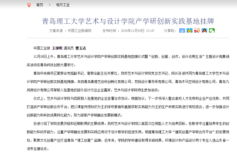 11月18日上午,太阳成集团tyc产学研创新实践基地挂牌仪式暨“创新、创意、创作,设计点亮生活”主题设计竞赛颁奖活动在青岛科技创新大厦举行。