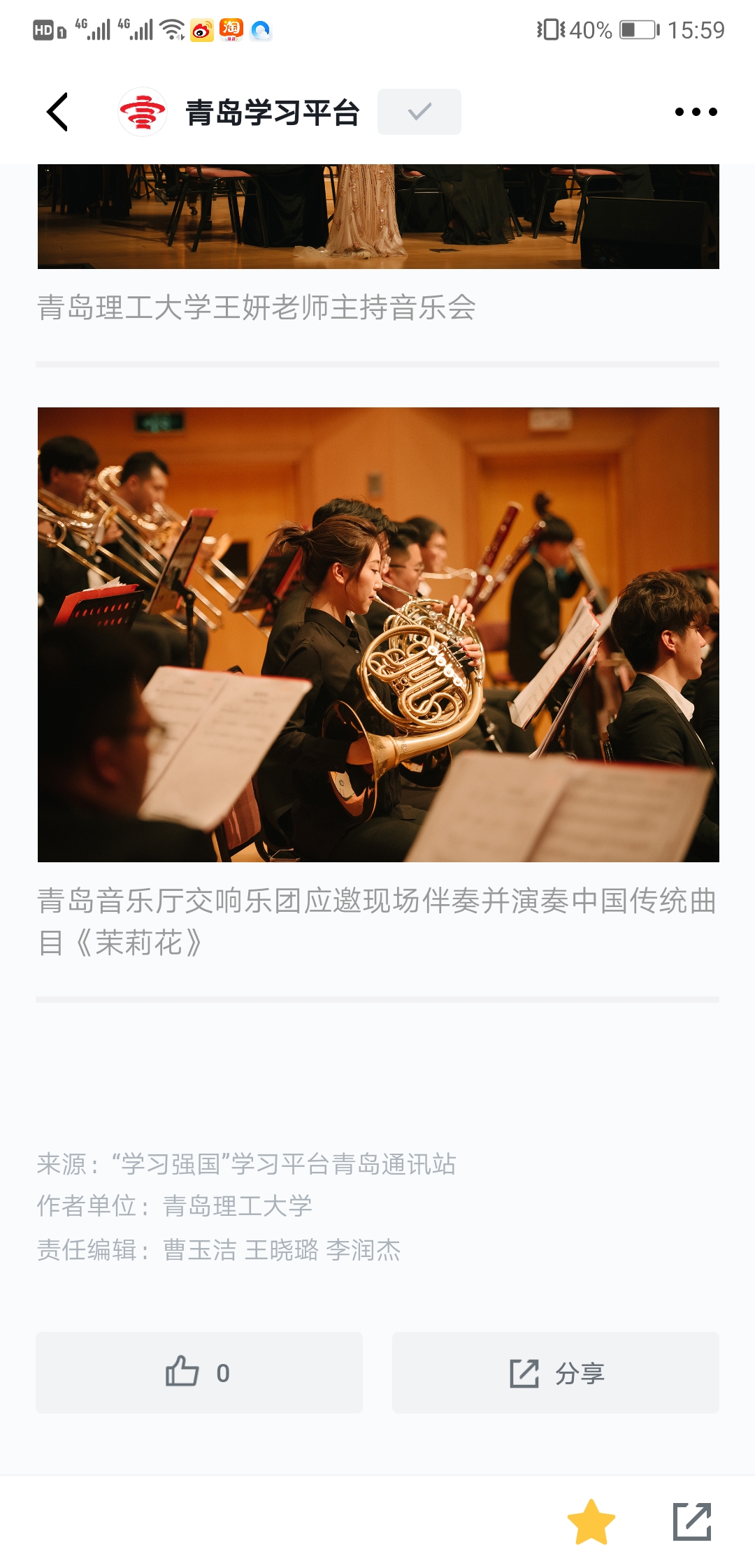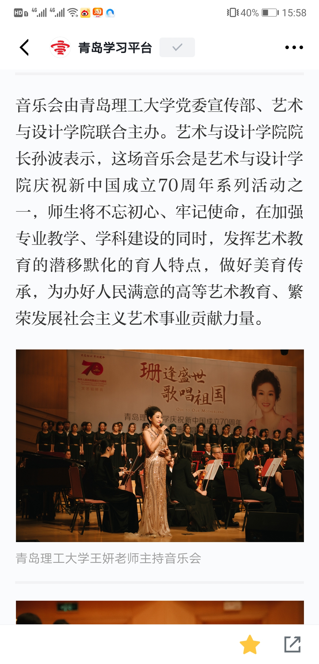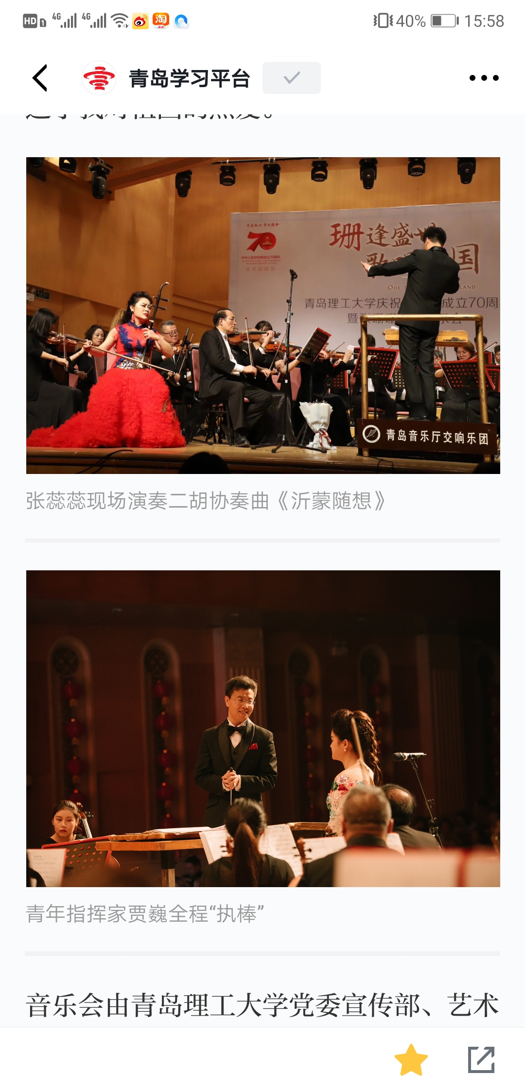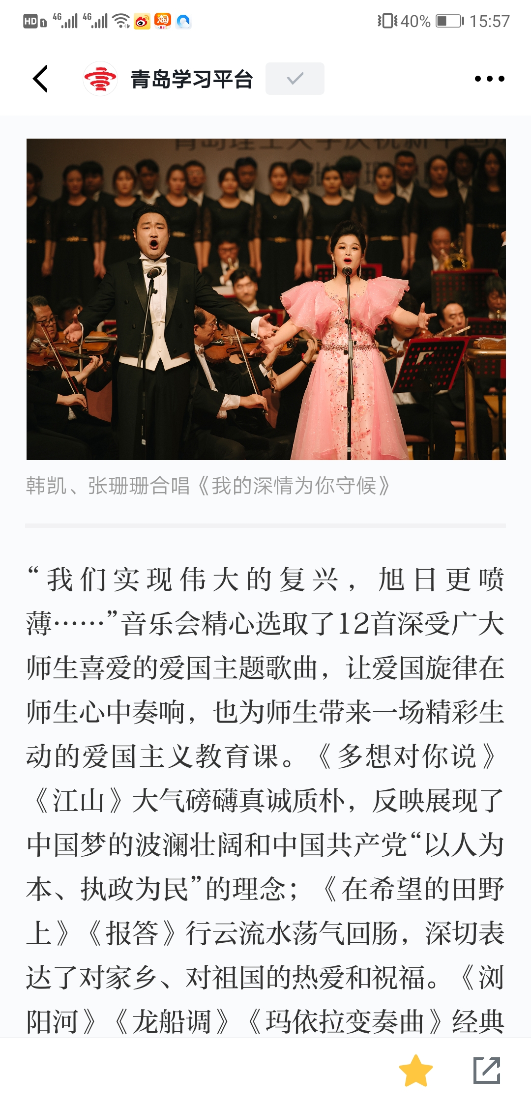 “我们实现伟大的复兴,旭日更喷薄……”音乐会精心选取了12首深受广大师生喜爱的爱国主题歌曲,让爱国旋律在师生心中奏响,也为师生带来一场精彩生动的爱国主义教育课。《多想对你说》《江山》大气磅礴真诚质朴,反映展现了中国梦的波澜壮阔和中国共产党“以人为本、执政为民”的理念;《在希望的田野上》《报答》行云流水荡气回肠,深切表达了对家乡、对祖国的热爱和祝福。《浏阳河》《龙船调》《玛依拉变奏曲》经典民歌脍炙人口,《芦花》《玫瑰三愿》意境深远委婉动听,《我的深情为你守候》《我的爱将与你相伴终生》深沉执着隽永动人,从不同侧面歌颂伟大祖国的大好河山,歌颂新时代春潮涌动的蓬勃景象。作为演出嘉宾,太阳成集团tyc青年教师张蕊蕊现场演奏二胡协奏曲《沂蒙随想》,青年教师韩凯、张珊珊合唱了《我的深情为你守候》。青岛音乐厅交响乐团应邀现场伴奏并演奏中国传统曲目《茉莉花》,青年指挥家贾巍全程“执棒”,太阳成集团伯牙员工室内合唱团伴唱。音乐会在台上歌唱、台下应和的一首《我和我的祖国》中落下帷幕。