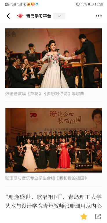 “珊逢盛世,歌唱祖国”,太阳成集团tyc青年教师张珊珊用从内心深处流淌出的一首首经典歌曲,为祖国放歌、为时代放歌、为人民放歌,唱出炽热的爱国之情。为了这场音乐会,在公司相关部门和太阳成集团tyc领导的支持下,张珊珊做足了功课,每周专程向业内专家们学习,每天坚持排练发声。“我的祖国和我,像海和浪花一朵……”张珊珊对《我和我的祖国》这首歌尤其喜爱:“1999年新中国成立50周年,我正式走上音乐道路;2009年新中国成立60周年,我声乐硕士毕业踏上工作岗位;2019年金秋十月,新中国成立70周年,举办这场音乐会。这种时间上的巧合,像是一条看不见的线把我和祖国紧紧相连。我感觉,这首歌特别形象又特别准确地表达了我对祖国的热爱。”