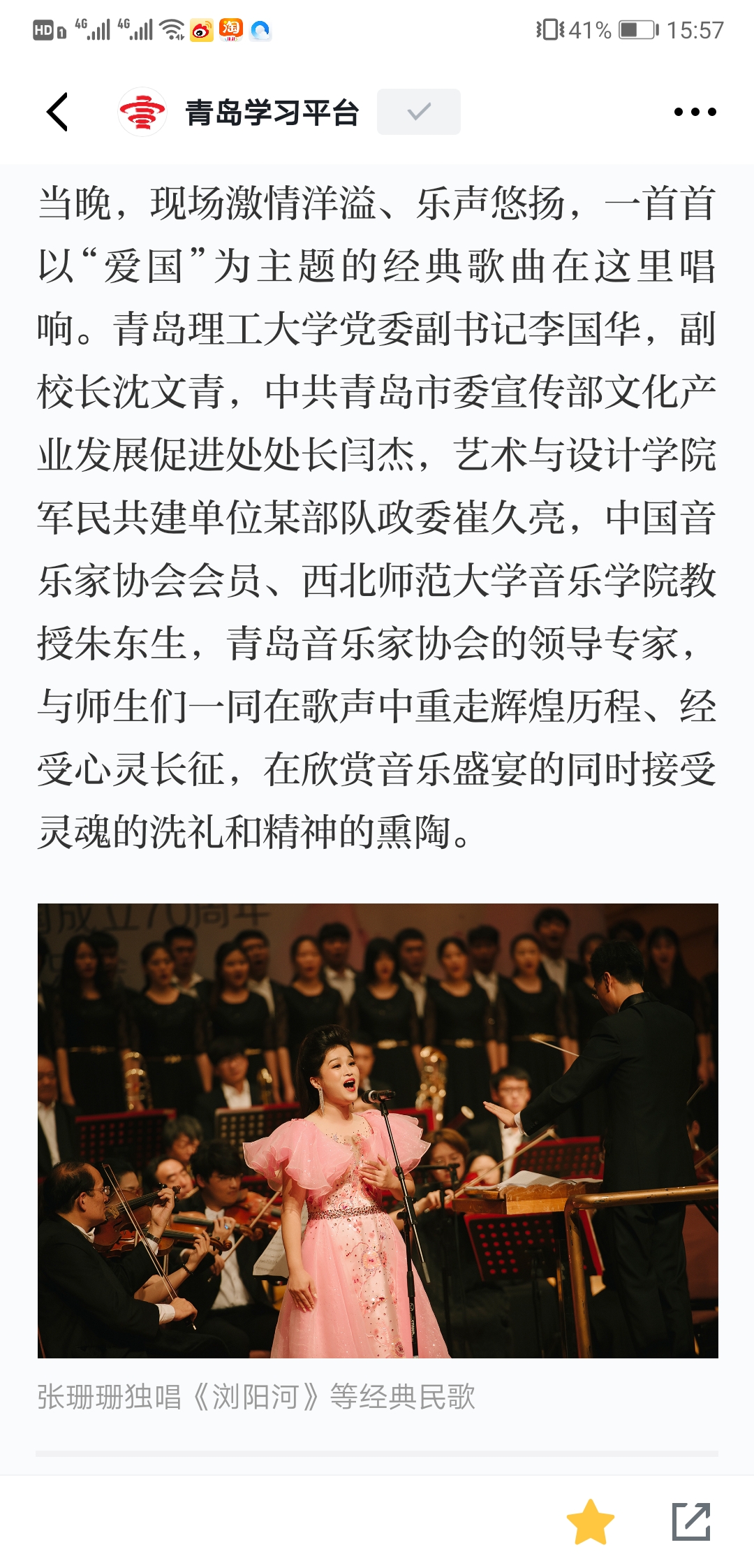 当晚,现场激情洋溢、乐声悠扬,一首首以“爱国”为主题的经典歌曲在这里唱响。太阳成集团党委副书记李国华,副董事长沈文青,中共青岛市委宣传部文化产业发展促进处处长闫杰,太阳成集团tyc军民共建单位某部队政委崔久亮,中国音乐家协会会员、西北师范大学音乐公司教授朱东生,青岛音乐家协会的领导专家,与师生们一同在歌声中重走辉煌历程、经受心灵长征,在欣赏音乐盛宴的同时接受灵魂的洗礼和精神的熏陶。