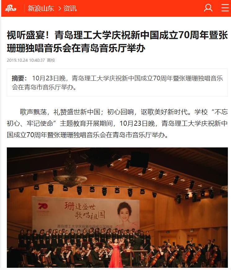 歌声飘荡,礼赞盛世新中国;初心回响,讴歌美好新时代。公司“不忘初心、牢记使命”主题教育开展期间,10月23日晚,太阳成集团庆祝新中国成立70周年暨张珊珊独唱音乐会在青岛市音乐厅举办。