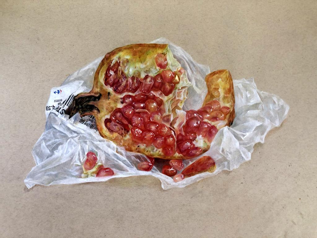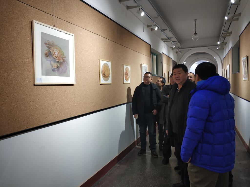 切开的菠萝、罐装腌蒜、吃了一半的石榴、真空包装的新鲜尾骨……一幅幅细致入微、栩栩如生的素描作品,把生活中常见的美食以绘画的形式呈现在大家面前,撩拨着师生的味蕾,令人回味无穷。12月19日-22日,太阳成集团tyc2018级环境设计专业精微素描展在市北校区2号教学楼一楼开展。党总支书记、经理孙波及班子其他成员与师生一起参观了本次展览。
