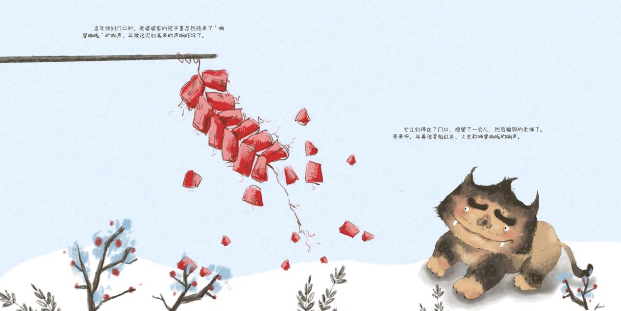 殷艺榕同学创作的《年》以中国传统神话中的“年兽”传说为核心题材,聚焦春节这一重要传统节日。作品紧扣“传承传统文化”的创作主旨,通过童趣盎然的叙事方式,生动讲述了年兽的传说及挂红灯笼、放鞭炮等过年习俗的由来,让孩子们在阅读中理解传统节日背后的文化内涵。在艺术表达上,作品采用质朴手绘风格,以传统褐色、红色、青色为主色调,人物与年兽形象夸张可爱、充满想象力,充分展现了创作者扎实的专业功底与独特的艺术构思。