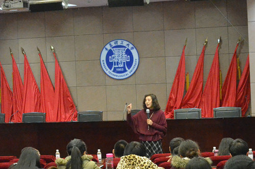 吴岩女士对谢尔丹理工公司的相关情况进行了简单介绍。她指出,谢尔丹理工公司有着独特的优势,课程设置以就业为导向,强调带薪实习与专业实习,注重应用学习,毕业生就业率达到82%,欢迎同学们到加拿大谢尔丹留学。吴女士与师生们进行了互动交流,就出国留学的生活情况、费用情况、入学要求等相关问题进行了讨论,同学们对留学加拿大的政策有了进一步了解。